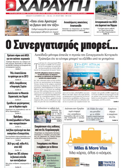 Η «Χαραυγή» στο κύριο της θέμα με τίτλο «Ο Συνεργατισμός μπορεί», γράφει ότι αισιόδοξο μήνυμα ότι ο Συνεργατισμός θέλει και μπορεί να εξέλθει από το μνημόνιο και να επιστρέψει σε μερικά χρόνια πίσω στα μέλη του, έστειλε χθες η ηγεσία της Συνεργατικής Κεντρικής Τράπεζας στην τελευταία ετήσια γενική συνέλευση πριν την κρατικοποίηση του κινήματος. Αλλού, γράφει για εκδήλωση διαμαρτυρίας έξω από τη Βουλή που πραγματοποίησαν οι διασώστες-πληρώματα ασθενοφόρων, ζητώντας την άμεση λειτουργία τεσσάρων νέων σταθμών ασθενοφόρων σε Πέγεια, Κλήρου, Ορόκλινη και Λεμεσό. Σε άλλο της θέμα γράφει ότι η ΕΔΟΝ κατήγγειλε καθηγητή στη Λεμεσό για φασιστική συμπεριφορά.
