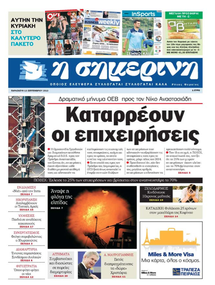 «Η Σημερινή» κάτω από τον τίτλο «Καταρρέουν οι επιχειρήσεις», γράφει στο κύριο της θέμα ότι η ΟΕΒ απηύθυνε δραματικό S.O.S προς τον Πρόεδρο Αναστασιάδη τονίζοντας ότι οι επιχειρήσεις έχουν εξαντλήσει κάθε διαθέσιμο ρευστό απόθεμά τους και αδυνατούν να εκπληρώσουν τις οικονομικές τους υποχρεώσεις ακόμα και προς το κράτος. Αλλού, γράφει ότι ο διαπραγματευτής της ε/κ πλευράς για το Κυπριακό Ανδρέας Μαυρόγιαννης, σε συνέντευξη του στο Sigmalive διαμηνύει ότι οι λεγόμενες παραχωρήσεις του τέως Προέδρου της Δημοκρατίας δεν θα βρίσκονται στο τραπέζι των διαπραγματεύσεων. Σε άλλο της θέμα γράφει για το οριστικό αδιέξοδο της ενδιάμεσης λύσης φυσικού αερίου καθώς η Itera δεν έκανε νέα προσφορά στη ΔΕΦΑ.