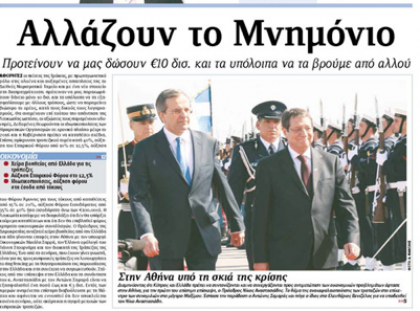 Η «Σημερινή», υπό τον τίτλο «Βγαίνει… καπνός μέσα από το πάρε-δώσε», γράφει ότι ο Πρόεδρος Αναστασιάδης βρίσκεται στην Αθήνα με καυτή ατζέντα και στο επίκεντρο των επαφών του θα βρεθεί η προσπάθεια της Κύπρου για σύναψη δανειακής σύμβασης από τον Μηχανισμό Στήριξης της ΕΕ. Γράφει, επίσης, ότι την ερχόμενη Πέμπτη, και συγκεκριμένα στη συνεδρία του Eurogroup που θα πραγματοποιηθεί στις Βρυξέλλες, αναμένονται τα σπουδαία γύρω από το κλείσιμο συμφωνίας επί της αρχής για το κυπριακό μνημόνιο. Επίσης, δημοσιεύει συνέντευξη του Προέδρου Αναστασιάδη, ο οποίος είπε ότι πρέπει το συντομότερο να καταρτιστεί συνολικό πλαίσιο προτάσεων για λύση του Κυπριακού και ότι το σχέδιο Ανάν δεν βρίσκεται στην ατζέντα.