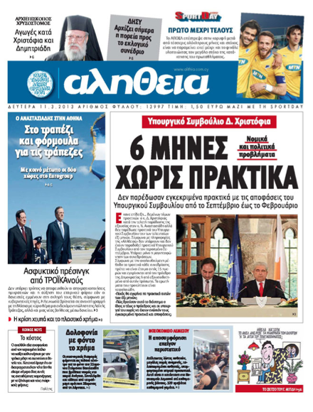 Η «Αλήθεια», υπό τον τίτλο «6 μήνες χωρίς πρακτικά», γράφει ότι ο Δημήτρης Χριστόφιας έκανε επίδειξη δεμένων τόμων πρακτικών κατά την τελετή παράδοσης της εξουσίας στον Νίκο Αναστασιάδη, αλλά δεν παρέδωσε πρακτικά του Υπουργικού Συμβουλίου του των τελευταίων έξι μηνών. Γράφει, επίσης, ότι καθοριστική είναι η τρέχουσα εβδομάδα, με τον Πρόεδρο Αναστασιάδη, μετά τις επαφές του σήμερα στην Αθήνα, να συνεχίζει τις προσπάθειες στις Βρυξέλλες με Ευρωπαίους ηγέτες. Επίσης, γράφει ότι δεν υπάρχει τρόπος να αποφευχθούν οι αποκρατικοποιήσεις ημικρατικών οργανισμών και η αύξηση του εταιρικού φόρου, εάν οι δανειστές εμμένουν στην σκληρή τους θέση, σύμφωνα με κυβερνητικές πηγές.