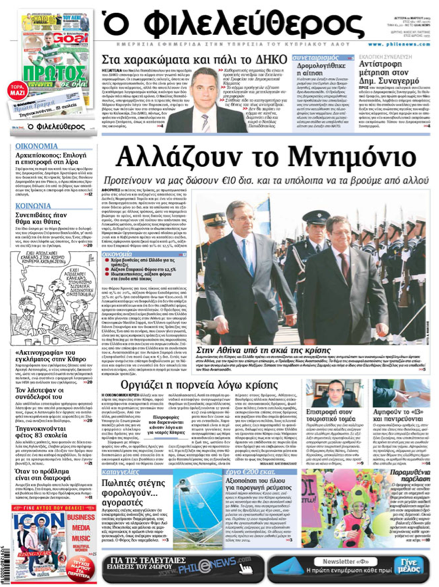 Ο «Φιλελεύθερος», υπό τον τίτλο «Αλλάζουν το Μνημόνιο», γράφει ότι αφόρητες οι πιέσεις της Τρόικας, με πρωταγωνιστικό ρόλο στις ολοένα και αυξημένες απαιτήσεις της το Διεθνές Νομισματικό Ταμείο και με ένα νέο στοιχείο στη διαπραγμάτευση, την πρόταση για παραχώρηση δανείου μόνο 10 δισεκατομμύρια ευρώ και τα υπόλοιπα να εξασφαλιστούν με άλλους τρόπους. Γράφει, επίσης, ότι η εξαγγελία του Νικόλα Παπαδόπουλου για την προεδρία του ΔΗΚΟ επαναφέρει το κόμμα στον γνωστό πόλεμο χαρακωμάτων. Επίσης, γράφει ότι η οικονομική κρίση άλλαξε και τον χάρτη της πορνείας στην Κύπρο, αφού καταγράφονται σοκαριστικά στοιχεία, αλλά και περιπτώσεις γυναικών που συγκλονίζουν.