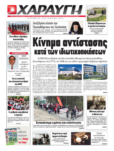 Η «Χαραυγή», υπό τον τίτλο «Κίνημα αντίστασης κατά των ιδιωτικοποιήσεων», γράφει ότι η ΠΕΟ θα τεθεί επικεφαλής της προσπάθειας για ανάληψη πρωτοβουλιών, ώστε να δημιουργηθεί ένα ισχυρό κίνημα αντίστασης από την κοινωνία ενάντια στις νεοφιλελεύθερες πολιτικές, και επαναλαμβάνει την πάγια θέση της ότι οι οργανισμοί που διαδραματίζουν στρατηγικό ρόλο πρέπει να παραμείνουν δημόσιοι. Γράφει, επίσης, ότι ο Αρχιεπίσκοπος Χρυσόστομος κινεί αγωγές για την εμπλοκή της Ελληνικής Τράπεζας στους όρους εντολής της Pimco, ενώ τάσσεται και υπέρ της εξόδου της Κύπρου από την Ευρωζώνη. Επίσης, γράφει ότι εκατοντάδες νέοι από κάθε άκρη της Κύπρου συμμετείχαν στο συναπάντημα ειρήνης που διοργάνωσε η ΕΔΟΝ στο Τρόοδος.
