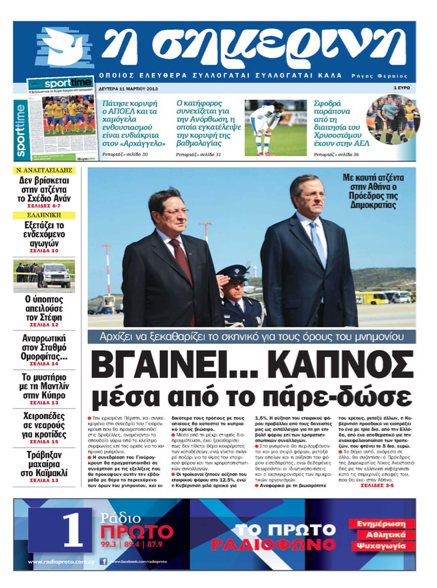 Η «Σημερινή», υπό τον τίτλο «Βγαίνει… καπνός μέσα από το πάρε-δώσε», γράφει ότι ο Πρόεδρος Αναστασιάδης βρίσκεται στην Αθήνα με καυτή ατζέντα και στο επίκεντρο των επαφών του θα βρεθεί η προσπάθεια της Κύπρου για σύναψη δανειακής σύμβασης από τον Μηχανισμό Στήριξης της ΕΕ. Γράφει, επίσης, ότι την ερχόμενη Πέμπτη, και συγκεκριμένα στη συνεδρία του Eurogroup που θα πραγματοποιηθεί στις Βρυξέλλες, αναμένονται τα σπουδαία γύρω από το κλείσιμο συμφωνίας επί της αρχής για το κυπριακό μνημόνιο. Επίσης, δημοσιεύει συνέντευξη του Προέδρου Αναστασιάδη, ο οποίος είπε ότι πρέπει το συντομότερο να καταρτιστεί συνολικό πλαίσιο προτάσεων για λύση του Κυπριακού και ότι το σχέδιο Ανάν δεν βρίσκεται στην ατζέντα.