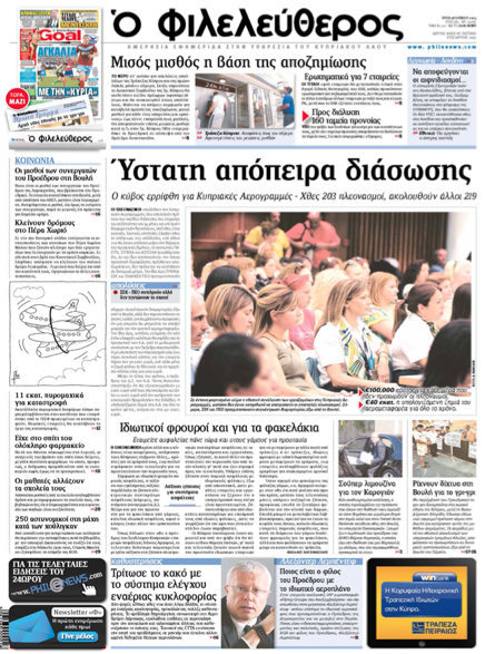 Ο «Φιλελεύθερος», κάτω από τον τίτλο «Ύστατη απόπειρα διάσωσης» γράφει ότι γεγονός είναι από χθες οι πλεονασμοί υπαλλήλων των Κυπριακών Αερογραμμών που αποτελούν πρόνοια του σχεδίου διάσωσης της εταιρείας και συζητούνται για 14 μήνες και επί τριών διαφορετικών διοικήσεων. Γράφει, επίσης, ότι το νερό στ’ αυλάκι για απολύσεις υπαλλήλων της τράπεζας Κύπρου και της πρώην Λαϊκής μπαίνει σήμερα. Σύμφωνα με το σχετικό δημοσίευμα της εφημερίδας εκτός απρόοπτου το ΔΣ της Τράπεζας Κύπρου θα υιοθετήσει σχέδιο πρόωρων αφυπηρετήσεων το οποίο θα ανακοινωθεί στους υπαλλήλους. Αλλού γράφει ότι μέχρι και για την προστασία για τα φακελάκια από γάμους, καλείται ιδιωτική ασφάλεια, αφού ο κόσμος έχασε πλέον την εμπιστοσύνη του.