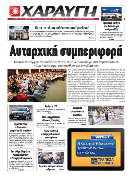 Η «Χαραυγή», στο κύριο θέμα με τίτλο «Αυταρχική συμπεριφορά» γράφει ότι σε εποχές αυταρχικών καθεστώτων και φασιστικής νοοτροπίας παραπέμπουν οι ενέργειες της Κυβέρνησης για τις Κυπριακές Αερογραμμές την τελευταία εβδομάδα. Γράφει, επίσης, ότι οκτώ ειδικοί συνεργάτες με «παχυλούς» μισθούς έχουν προσληφθεί στο Προεδρικό από τον Πρόεδρο Ν. Αναστασιάδη με τη σύμφωνη γνώμη των συγκυβερνώντων κομμάτων και με ειδικές αποστολές υπεράσπισης του κυβερνητικού έργου και με συντονισμένες επιθέσεις εναντίον του ΑΚΕΛ και της προηγούμενης κυβέρνησης. Γράφει ακόμη ότι απογοητευμένοι με τον Πρόεδρο Αναστασιάδη είναι οι επαγγελματίες ψαράδες οι οποίοι ετοιμάζουν δυναμικές κινητοποιήσεις.