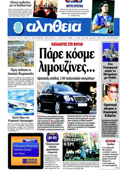 Η «Αλήθεια», στο κύριο της θέμα με τίτλο «Πάρε κόσμε λιμουζίνες…» δημοσιεύει τον κατάλογο που κατέθεσε χθες η κυβέρνηση στην κοινοβουλευτική επιτροπή οικονομικών με τους αξιωματούχους του κράτους, των ημικρατικών οργανισμών και της τοπικής αυτοδιοίκησης που απολαμβάνουν δωρεάν αυτοκίνητα , κάποιοι μάλιστα και με οδηγούς. Γράφει, επίσης, ότι ο Υπουργός Οικονομικών Χάρης Γεωργιάδης θα υποβάλει αύριο στο υπουργικό συμβούλιο προς συζήτηση πρόταση για πώληση του ποσοστού που κατέχει το κράτος στις Δασικές Βιομηχανίες(πάνω από 51%). Αλλού, γράφει ότι με πρόταση που θα συζητηθεί αύριο στο υπουργικό συμβούλιο ο Υπουργός Οικονομικών ζητά να δοθεί οριστικό τέλος στο σήριαλ με το διορισμό του Λάμπρου Καικίτη στο ΔΣ της Κεντρικής Τράπεζας.
