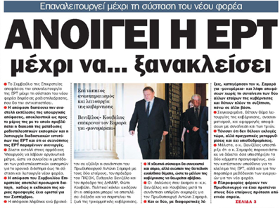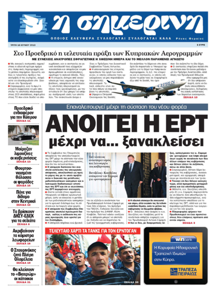 Η «Σημερινή», υπό τον τίτλο «Ανοίγει η ΕΡΤ μέχρι να …ξανακλείσει», γράφει ότι το Συμβούλιο της Επικρατείας αποφάσισε την επαναλειτουργία της ΕΡΤ μέχρι τη σύσταση του νέου φορέα δημόσιας ραδιοτηλεόρασης που θα την αντικαταστήσει. Γράφει, επίσης, ότι με συνεχείς ανατροπές σφραγίστηκε η χθεσινή κρίσιμη ημέρα στις Κυπριακές Αερογραμμές και το μέλλον παραμένει άγνωστο, καθώς οι τελευταίες πράξεις της συντριβής ή της σωτηρίας, αναμένεται να ολοκληρωθούν στη Βουλή και στο Προεδρικό. Αλλού, η εφημερίδα αναφέρεται στη χθεσινή σύσκεψη στο Προεδρικό Μέγαρο με θέμα την εξυγίανση της Τράπεζας Κύπρου, υπό τον Πρόεδρο της Δημοκρατίας.