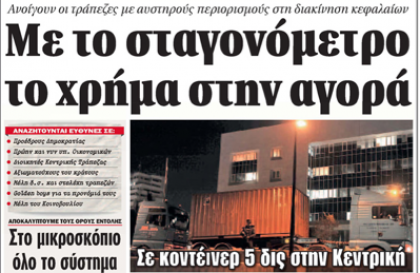Η εφημερίδα «Η Σημερινή» με τίτλο «Πρώτο τεστ αντοχής» γράφει ότι επαναλειτουργούν σήμερα όλες οι τράπεζες με περιοριστικά μέτρα και δίδει λεπτομέρειες για τον τρόπο, τις ώρες λειτουργίας και τα μέτρα της αστυνομίας. Σε άλλο θέμα αναφέρεται σε δηλώσεις του ΥΠΟΙΚ, Μιχάλη Σαρρή σε εκπομπή του Σίγμα πως η διαπραγματευτική μας ομάδα στο Γιούρογκρουπ γνώριζε ότι θα ετίθετο θέμα κουρέματος αλλά ελπίζαμε να μην το έπρατταν. Αλλού γράφει πως έπαυσε τα ΔΣ των τραπεζών ο Διοικητής και σημειώνει πως ο Πανίκος Δημητριάδης βρέθηκε στο μάτι του κυκλώνα.