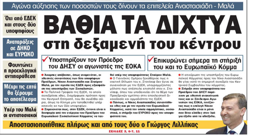 «Η Σημερινή» τιτλοφορεί το κύριο θέμα της «Βαθιά τα δίχτυα στη δεξαμενή του κέντρου» και γράφει ότι άκαρπες απέβησαν, όπως αναμενόταν, οι χθεσινές συναντήσεις των δύο υποψηφίων προέδρων Νίκου Αναστασιάδη και Σταύρου Μαλά με την ηγεσία της ΕΔΕΚ προς εξασφάλιση της υποστήριξης των Σοσιαλιστών και ότι τα δύο επιτελεία δίνουν αγώνα αύξησης των ποσοστών τους. Αλλού αναφέρει ότι αποστασιοποιήθηκε πλήρως και από τους δύο ο Γιώργος Λιλλήκας. Σε άλλο θέμα γράφει ότι λιωμένα φάρμακα και θρυμματισμένα-αλεσμένα γυαλιά βρέθηκαν σε παιδική κρέμα που προοριζόταν για τον μικρό Σταύρο.