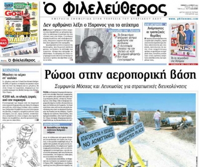 Ο «Φιλελεύθερος» με κύριο τίτλο «Άνω-κάτω στην Αστυνομία» γράφει στο κύριο θέμα του ότι με οδηγίες του Υπουργού Δικαιοσύνης Ιωνά Νικολάου άλλαξαν επικεφαλής σε νευραλγικές υπηρεσίες στην Αστυνομία, προκαλώντας έντονες αντιδράσεις εντός και εκτός του αστυνομικού σώματος. Προσθέτει ότι μετατίθενται οι υπεύθυνοι ΤΑΕ, ΟΠΕ, Κλιμακίων Συλλογής Πληροφοριών, ΥΑΜ και ΥΚΑΝ. Σε άλλο θέμα γράφει ότι η Κυβέρνηση προωθεί την αποπαγοποίηση δύο θέσεων κλίμακας Α14 στο Τμήμα Κτηματολογίου, την ώρα που εκκρεμεί η αποπαγοποίηση δεκάδων θέσεων σε Τμήματα του δημοσίου, ενώ το θέμα θα συζητηθεί εκτάκτως αύριο στην Επιτροπή Οικονομικών της Βουλής. Επίσης, αναφέρει ότι η Κυβέρνηση θα παρουσιάσει ολοκληρωμένη πρόταση για την Αμμόχωστο.