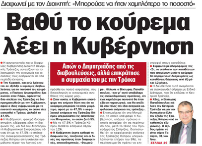 Η χθεσινή ανακοίνωση από το Προεδρικό του ύψους του κουρέματος στις ανασφάλιστες καταθέσεις στην Τράπεζα Κύπρου, που έκλεισε στο 47,5% και η διαφωνία της Κυβέρνησης με την Τρόικα και την Κεντρική Τράπεζα, επί τούτου, είναι το κυρίαρχο θέμα στα πρωτοσέλιδα του σημερινού Τύπου. Προβάλλονται επίσης η χθεσινή διάσκεψη Τύπου της Υπουργού Εργασίας για τη μεταρρύθμιση του κράτους πρόνοιας, η πρόταση της ΕΤΥΚ για κλιμακωτές μειώσεις μισθών μέχρι και 30% για τους τραπεζοϋπαλλήλους, μελέτη του Πανεπιστημίου Κύπρου για την οικονομία, επικείμενη επίσκεψη του Ισραηλινού Υπουργού Ενέργειας, ανακοίνωση της γερμανικής πρεσβείας για το κούρεμα και δηλώσεις του Γερμανού Ευρωβουλευτή Γεώργιου Χατζημαρκάκη.