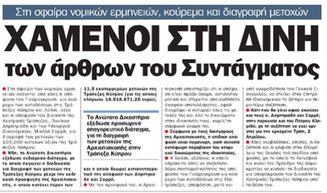 Η «Σημερινή» προβάλλει το κύριό της θέμα υπό τον τίτλο «Χαμένοι στη δίνη των άρθρων του Συντάγματος» και γράφει ότι καλείται το Σύνταγμα να δώσει απαντήσεις κυρίως σε ό,τι αφορά την απόφαση του Διοικητή της Κεντρικής Τράπεζας και του Υπουργού Οικονομικών για διαγραφή των μετοχών των κατόχων αξιών της Τράπεζας Κύπρου. Σε άλλο θέμα η «Σ» γράφει ότι χθες, κατά το άνοιγμα των τραπεζών και υπό το φως των περιοριστικών μέτρων, αναδείχθηκε η ωριμότητα των Κυπρίων σε όλο της το μεγαλείο. Επίσης πρωτοσέλιδα η εφημερίδα αναφέρει ότι γνώριζε η Κεντρική Τράπεζα για το κούρεμα.