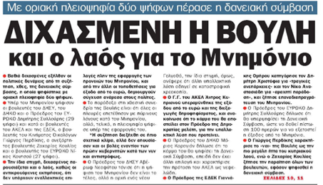 «Η Σημερινή» υπό τον κύριο τίτλο «Διχασμένη η Βουλή και ο λαός για το Μνημόνιο» γράφει ότι βαθιά διχασμένες εξήλθαν οι πολιτικές δυνάμεις από τη συζήτηση χθες της δανειακής σύμβασης η οποία ψηφίστηκε με οριακή πλειοψηφία δύο ψήφων. Αλλού, γράφει ότι η Κύπρος μετατρέπεται σε χώρα άνεργων και ήδη είναι δευτεραθλητής στην ΕΕ στην ανεργία, μετά την Ελλάδα με 14,2%. Επίσης, η εφημερίδα αναφέρεται στη συνέντευξη του Προέδρου Νίκου Αναστασιάδη στη ΝΕΤ, ο οποίος είπε πως οι αποφάσεις του Eurogroup ήταν προειλημμένες και αναφέρει ότι «πήγα αξιόπιστος και γύρισα αναξιόπιστος».