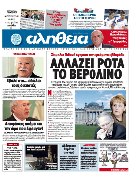 Η «Αλήθεια» τιτλοφορεί το κύριο θέμα της «Αλλάζει ρότα το Βερολίνο» και γράφει ότι η Γερμανία δεν επιμένει στο κούρεμα καταθέσεων ούτε η Ευρώπη χρειάζεται τα χρήματα του ΔΝΤ για την Κύπρο αλλά τη συμμετοχή του στη διαμόρφωση του πακέτου διάσωσης, δηλώνει στενός συνεργάτης της Αγκελα Μέρκελ, Μίκαελ Μάιστερ. Προβάλλει επίσης τη δήλωση του πρώην Υπουργού Αμυνας Κώστα Παπακώστα ενώπιον του Μόνιμου Κακουργιοδικείου στη Λάρνακα όπου απέδωσε την άμεση ευθύνη για την τραγωδία στο Μαρί στον συνταγματάρχη Γ. Γιωργιάδη. Αναφέρει επίσης ότι λίγες ώρες πριν φύγει από το Υπουργείο Εσωτερικών, η Ελένη Μαύρου έδινε άδεια για αιολικό πάρκο σε περιοχή Natura στα Λεύκαρα την οποία ο νέος ΥΠΕΣ ακύρωσε.
