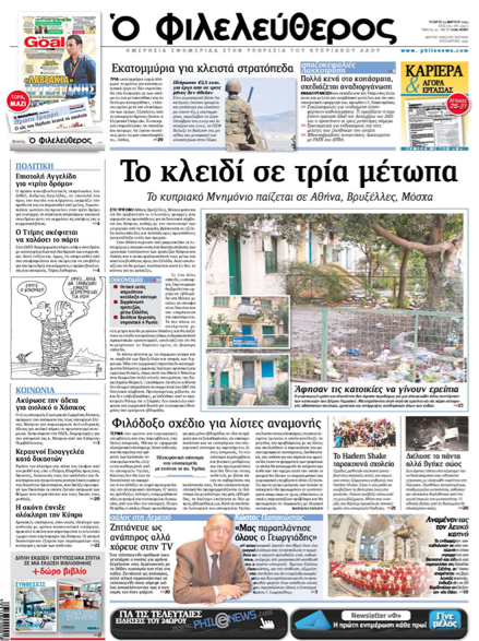 «Ο Φιλελεύθερος» προβάλλει το κύριο θέμα του με τίτλο «Το κλειδί σε τρία μέτωπα» και γράφει ότι στο τρίγωνο Αθήνα, Βρυξέλλες, Μόσχα φαίνεται ότι θα τραβηχτούν οι τελευταίες γραμμές που αφορούν στις προσπάθειες για τη δανειακή σύμβαση της Κύπρου. Ο «Φ» δημοσιεύει επίσης θέμα στο οποίο αναφέρει ότι τέρμα στο ‘μέσο’ για χειρουργικές επεμβάσεις και στις παρεμβάσεις στις λίστες αναμονής αφού τίθεται σε εφαρμογή ηλεκτρονικό σύστημα με λίστα ασθενών που θα τηρείται στα τμήματα των νοσοκομείων με επόπτη το Υπουργείο Υγείας. Προβάλλει επίσης φωτογραφικό ρεπορτάζ κατοικιών στη Λεμεσό όπου η οικονομική κρίση και στενότητα δεν αφήνει περιθώρια για μια στοιχειώδη έστω συντήρηση και μετατρέπονται σε ερείπια.