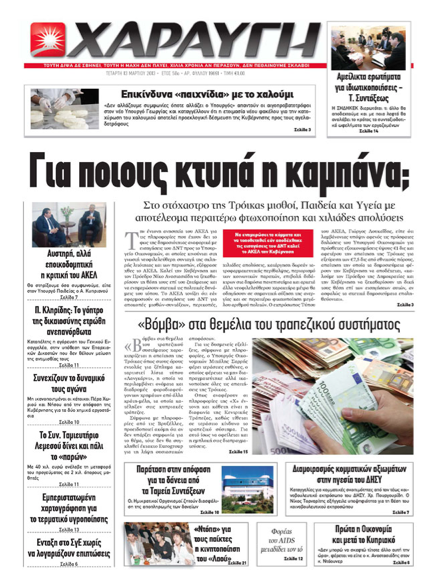 Η «Χαραυγή» τιτλοφορεί το κύριο θέμα της «Για ποιους κτυπά η καμπάνα;» και αναφέρεται στην έντονη ανησυχία του ΑΚΕΛ για τις πληροφορίες που έχουν δει το φως της δημοσιότητας αναφορικά με εισηγήσεις του ΔΝΤ προς το Υπουργείο Οικονομικών, οι οποίες κινούνται στη γνωστή νεοφιλελεύθερη συνταγή της σκληρής λιτότητας και των περικοπών εξέφρασε χθες το ΑΚΕΛ. Προβάλλει επίσης πρωτοσέλιδα ότι «βόμβα» στα θεμέλια του τραπεζικού συστήματος χαρακτηρίζεται η απαίτηση της Τρόικας όπως στους όρους εντολής για ξέπλυμα καταρτιστεί λίστα τύπου «Λαγκάρντ» η οποία περιλαμβάνει ονόματα και διαδρομές φοροδιαφευγόντων χρημάτων από άλλα κράτη μέλη, τα οποία κατέληξαν στις κυπριακές τράπεζες. Η «Χ» αναφέρεται και στο θέμα με το χαλούμι και γράφει ότι οι αιγοπροβατοτρόφοι απάντησαν στον νέο υπουργό Γεωργίας ότι δεν αλλάζουν συμφωνίες όποτε αλλάζει υπουργός.