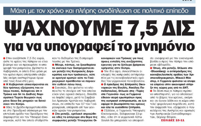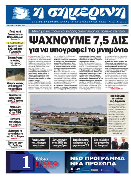 Κάτω από τον πρωτοσέλιδο τίτλο «Ψάχνουμε 7,5 δις για να υπογραφεί το μνημόνιο» «Η Σημερινή» γράφει ότι η κυβέρνηση δίνει μάχη με τον χρόνο για αποτροπή επιβολής ακόμη αυστηρότερων όρων από τους δανειστές μας. Προβάλλει επίσης τη σκόνη της Αφρικής που έπνιξε την Κύπρο και που προκαλεί δυσφορία και προβλήματα στην υγεία μεγάλης μερίδας συμπολιτών. Το φαινόμενο, αναφέρει, αναμένεται να διαρκέσει και τις επόμενες μέρες. Η «Σ» αναφέρεται επίσης στην αγόρευση του Γενικού Εισαγγελέα ενώπιον της ολομέλειας του Ανωτάτου Δικαστηρίου ο οποίος περιέγραψε με τα πιο μελανά χρώματα την οικονομική και κοινωνική κατάσταση της Κύπρου και είπε για τις προσφυγές δικαστών για τις μειώσεις των απολαβών τους ότι ετρώθη το γόητρο της δικαιοσύνης.