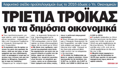 Η «Σημερινή» υπό τον τίτλο «Τριετία Τρόικας για τα δημόσια οικονομικά» γράφει ότι σύμφωνα με τα όσα παρουσίασε χθες στο Υπουργικό ο ΥΠΟΙΚ, οι περικοπές ξεπερνούν τα όρια της λιτότητας και ανέρχονται στο ένα δις για το 2016, για το 2014 φτάνουν τα 700 εκ ενώ το 2015 θα πρέπει να γίνουν εξοικονομήσεις ύψους 4% σε σχέση με το 2015. Αλλού αναφέρει ότι συστήνεται ερευνητική επιτροπή για την αγορά τ/κ γης από την CYTA στη Λάρνακα. Επίσης η «Σ» γράφει ότι μειώθηκαν κατακόρυφα οι καταθέσεις , σύμφωνα με στοιχεία της ΚΤ, μετά τις αποφάσεις του Eurogroup.