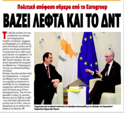 «Ο Φιλελεύθερος», υπό τον τίτλο «Το Eurogroup ψάχνει 7,5 δις», αναφέρει πως με προσδοκίες ότι σήμερα, τουλάχιστον, θα επιτευχθεί πολιτική συμφωνία για το κυπριακό μνημόνιο, συνεχίστηκαν μέχρι και τις πρωινές ώρες οι διαβουλεύσεις για τους τρόπους περιορισμού του δημόσιου χρέους της Κύπρου σε βιώσιμο επίπεδο. Αλλού αναφέρει πως κατάλογο πρώην δικαστικών ξεσκονίζουν στο Υπουργείο Δικαιοσύνης ώστε να μπορέσει να επαναλειτουργήσει το Συμβούλιο Αποφυλάκισης Επ’ Αδεία. Αλλού γράφει πως αμετακίνητοι παραμένουν οι δημόσιοι υπάλληλοι για τη δωρεάν ιατροφαρμακευτική περίθαλψη.