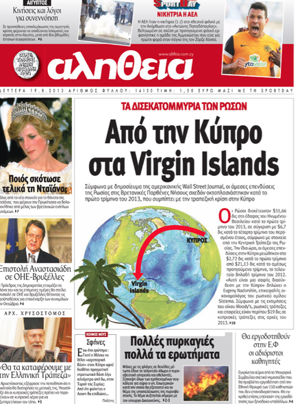 Με τίτλο «Από την Κύπρο στα Virgin Islands», η «Αλήθεια» στο κύριό της θέμα γράφει ότι σύμφωνα με δημοσίευμα της Wall Street Journal, οι άμεσες επενδύσεις της Ρωσίας στις βρετανικές Παρθένες Νήσους σχεδόν οκταπλασιάστηκαν κατά το πρώτο τρίμηνο του 2013, που συμπίπτει με την τραπεζική κρίση στην Κύπρο. Σε άλλο θέμα γράφει ότι ο Πρόεδρος της Δημοκρατίας ετοιμάζει το πλάνο του και τις επόμενες ημέρες θα στείλει επιστολή σε ΟΗΕ και Βρυξέλλες θέτοντας τις προϋποθέσεις για επανέναρξη των συνομιλιών τον Οκτώβριο. Αλλού γράφει ότι μάχες με τις φλόγες σε δεκάδες μέτωπα έδιναν το τελευταίο 48ωρο η πυροσβεστική υπηρεσία και εθελοντές.