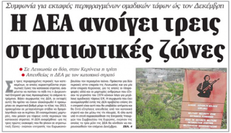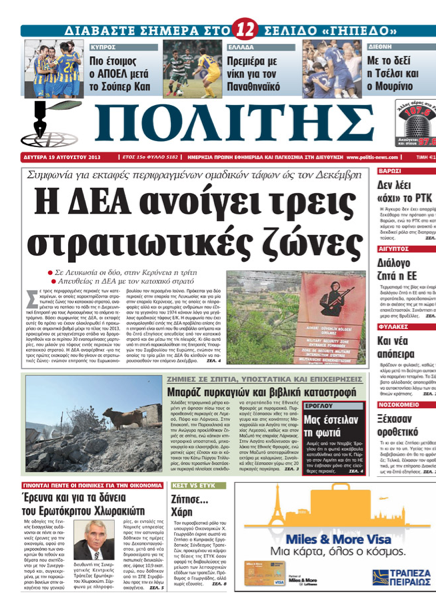 Με τίτλο «Η ΔΕΑ ανοίγει τρεις στρατιωτικές ζώνες» η εφημερίδα Πολίτης αναφέρεται στην συμφωνία για εκταφές περιφραγμένων ομαδικών τάφων ώς τον Δεκέμβρη. Η εφημερίδα γράφει οτι το επόμενο τετράμηνο η Διερευνητική Επιτροπή για τους Αγνοουμένους θα πατήσει το πόδι της σε τρείς περιφραγμένες περιοχές των κατεχομένων οι οποίες χαρακτηρίζονται στρατιωτικές ζώνες (διαβαστε περισσότερα στο Newsit.com.cy κάνοντας κλικ εδω) . Αλλου η εφημερίδα γράφει για τις 20 πυρκαγιές που ξέσπασαν χθες στην Κύπρο.