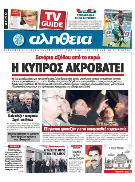 «Η Κύπρος ακροβατεί» είναι ο τίτλος του κυρίου θέματος της «Αλήθειας» που αναφέρεται σε σενάρια εξόδου από το ευρώ και φιλοξενεί όλες τις ειδήσεις από το μέτωπο του Eurogroup και της Βουλής με τη ψήφιση σήμερα των εννέα νομοσχεδίων. Αλλού η «Α» γράφει ότι έληξε άδοξα η εκστρατεία Σαρρή στη Μόσχα και ο ΥΠΟΙΚ επιστρέφει με άδεια χέρια αφού η Ρωσία δεν έδωσε ούτε επιμήκυνση του δανείου.Επίσης στην εφημερίδα φιλοξενείται η δήλωση του Κούρδου ηγέτη Αμπντουλλάχ Οτσαλάν ότι τα όπλα πρέπει να σωπάσουν.