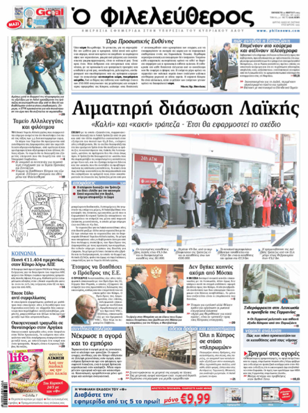 Υπό τον τίτλο «Αιματηρή διάσωση Λαϊκής» ο «Φιλελεύθερος» αναφέρεται στο σχέδιο για εξυγίανση της τράπεζας με την δημιουργία καλής και κακής τράπεζας.Αλλού γράφει ότι δεν βγήκε καπνός ακόμη από τη Μόσχα και ότι οι Ρώσοι διατηρούν ανοικτό κανάλι επικοινωνίας με τη Λευκωσία πλην όμως δεν υπάρχει αυτή τη στιγμή οτιδήποτε το συγκεκριμένο.Σε άλλο θέμα ο «Φ» αναφέρει ότι λόγω των εξελίξεων η αγορά και το εμπόριο νέκρωσαν και η Κύπρος είναι σε ‘στάση πληρωμών’.