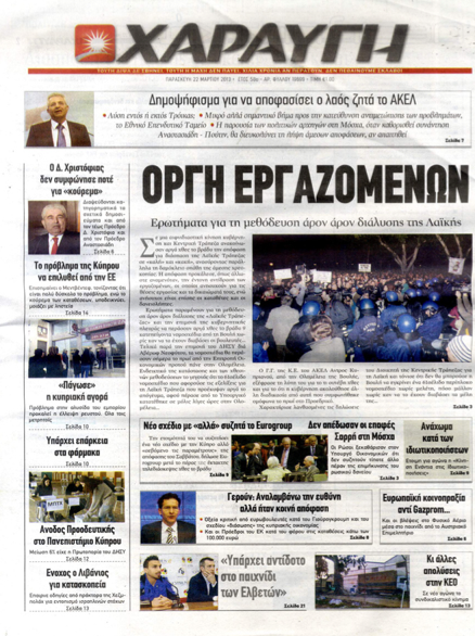 «Οργή εργαζομένων» είναι ο τίτλος του κυρίου θέματος της «Χαραυγής» που γράφει ότι διατυπώνονται ερωτήματα για τη μεθόδευση όπως αναφέρει, άρον –άρον διάλυσης της Λαϊκής και ότι τα σχετικά νομοσχέδια συζητούνται σήμερα στη Βουλή.Αλλού αναφέρεται στις δηλώσεις του ΓΓ του ΑΚΕΛ που ζητά μεταξύ άλλων δημοψήφισμα για λύση εντός ή εκτός Τρόικας. Σε άλλο δημοσίευμα η «Χ» γράφει ότι το Eurogroup συζητά το σχέδιο της Λευκωσίας αλλά θέτει παραμέτρους που να σέβονται την απόφασή του της 16ης Μαρτίου.