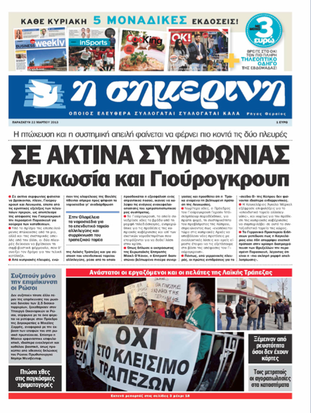 Η «Σημερινή» τιτλοφορεί το κύριό της θέμα «Σε ακτίνα συμφωνίας Λευκωσία και Γιούρογκρουπ» και αναφέρει ότι οι δύο πλευρές φαίνεται να βρίσκουν την συμβιβαστική φόρμουλα και ότι η Βουλή ψηφίζει σήμερα τα νομοσχέδια για αναδιάρθρωση.Σε άλλο δημοσίευμα η «Σ» αναφέρει ότι η Ρώσοι συζητούν μόνο επιμήκυνση του δανείου του 2011.Αλλού η εφημερίδα γράφει ότι λόγω των εξελίξεων στην Κύπρο, σημειώθηκε πτώση στις παγκόσμιες χρηματαγορές.