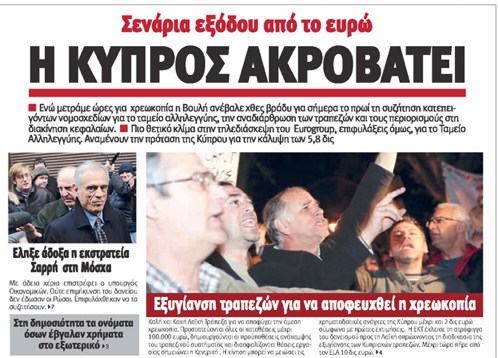 Υπό τον τίτλο «Αιματηρή διάσωση Λαϊκής» ο «Φιλελεύθερος» αναφέρεται στο σχέδιο για εξυγίανση της τράπεζας με την δημιουργία καλής και κακής τράπεζας.Αλλού γράφει ότι δεν βγήκε καπνός ακόμη από τη Μόσχα και ότι οι Ρώσοι διατηρούν ανοικτό κανάλι επικοινωνίας με τη Λευκωσία πλην όμως δεν υπάρχει αυτή τη στιγμή οτιδήποτε το συγκεκριμένο.Σε άλλο θέμα ο «Φ» αναφέρει ότι λόγω των εξελίξεων η αγορά και το εμπόριο νέκρωσαν και η Κύπρος είναι σε ‘στάση πληρωμών’.