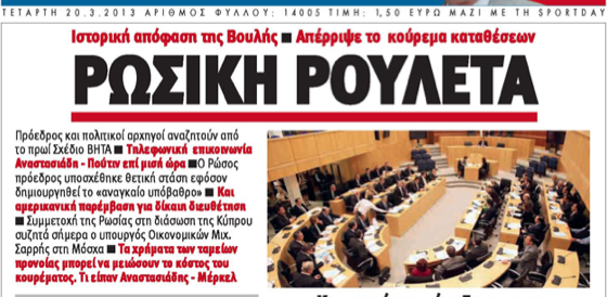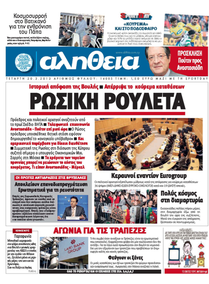 Η «Αλήθεια», στο κύριο θέμα και κάτω από τον τίτλο «Ρωσική ρουλέτα», γράφει ότι είναι ιστορική η απόφαση της Βουλής για απόρριψη του κυβερνητικού νομοσχεδίου που προέβλεπε την επιβολή τέλους επί των καταθέσεων. Αλλού γράφει ότι τηλεφωνική επικοινωνία μισής περίπου ώρας είχε χθες ο Πρόεδρος Αναστασιάδης με τον Ρώσο ομόλογό του, Βλαντίμιρ Πούτιν. Σε άλλο θέμα αναφέρεται στην κατάθεση του πρώην Υπουργού Άμυνας Κώστα Παπακώστα ενώπιον του Κακουργιοδικείου Λάρνακας για την έκρηξη στο Μαρί, έκρηξη η οποία πρόλαβε την παράδοση σχετικής με τους κινδύνους έκθεση που σκόπευε να παραδώσει στον Πρόεδρο Χριστόφια.