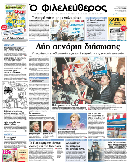 Ο «Φιλελεύθερος» γράφει στο κύριο θέμα, κάτω από τον τίτλο «Δύο σενάρια διάσωσης», ότι η Κυβέρνηση αναζητεί λύση μέσω των αποθεματικών συνταξιοδοτικών Ταμείων και Ταμείων Προνοίας που συμποσούνται στα 3,5 δισεκατομμύρια ευρώ, ενώ στο τραπέζι ευρίσκεται και το σχέδιο ελεγχόμενης χρεωκοπίας των δύο μεγάλων Τραπεζών, Λαϊκής και Κύπρου. Αλλη είδηση είναι ότι το Τμήμα Οδικών Μεταφορών μελετά 30 αιτήσεις από συνεργεία για εκτύπωση πινακίδων μοτοσυκλετών και μοτοποδηλάτων, που από τις 3 Ιουνίου πρέπει να φέρουν πινακίδες κυκλοφορίας μεγέθους Α4. Σε άλλο θέμα γράφει για τη χθεσινή τελετή ενθρόνισης του Πάπα Φραγκίσκου, στην πλατεία Αγίου Πέτρου, όπου παρέστη και ο Οικουμενικός Πατριάρχης Βαρθολομαίος.