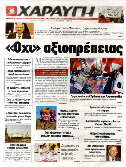 Η «Χαραυγή», στο κύριό της θέμα με τον τίτλο » `Οχι` αξιοπρέπειας», γράφει πως με 36 ψήφους εναντίον και 19 αποχές, η Βουλή των Αντιπροσώπων καταψήφισε χθες το νομοσχέδιο για κούρεμα των καταθέσεων. Αλλού παραθέτει εκτενή αποσπάσματα από τις ομιλίες αρχηγών ή εκπροσώπων των κομμάτων στην Ολομέλεια της Βουλής, προβάλλοντας τη θέση που διατύπωσε ο ΓΓ του ΑΚΕΛ, Άντρος Κυπριανού για απόσυρση από το μηχανισμό και εξεύρεση άλλων λύσεων. Σε άλλο θέμα γράφει ότι έντονες ήσαν, ιδιαιτέρως αργά χθες το απόγευμα, οι φήμες πως δύο στελέχη της Κυβέρνησης Αναστασιάδη, ο Υπουργός Οικονομικών Μιχάλης Σαρρής και ο Κυβερνητικός Εκπρόσωπος Χρήστος Στυλιανίδης, τελούσαν υπό παραίτηση.