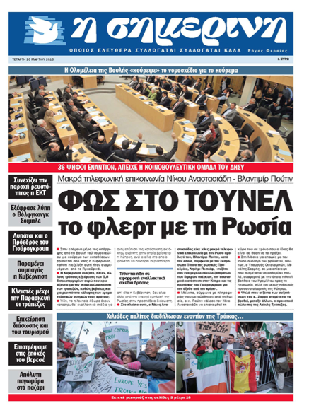 Η «Σημερινή», με τον τίτλο «Φως στο τούνελ το φλερτ με τη Ρωσία», γράφει στο κύριό της θέμα ότι ήδη, τα τελευταία 24ωρα, έχουν καταστρωθεί εναλλακτικά σχέδια για αντιμετώπιση της κατάστασης έκτακτης ανάγκης, στην οποία ευρίσκεται η Κύπρος και ότι, κατά τη χθεσινή τηλεφωνική επικοινωνία του με τον Πρόεδρο Αναστασιάδη, ο Πρόεδρος Πούτιν κάλεσε τον κ. Αναστασιάδη να επισκεφθεί τη Μόσχα. Σε άλλο θέμα γράφει πως επικρατεί απόλυτη παγωμάρα στο παζάρι και ότι κλειστές θα παραμείνουν οι Τράπεζες μέχρι την Παρασκευή. Άλλη είδηση είναι ότι, συμφώνως στοιχείων της Ευρωπαϊκής Επιτροπής, έχει καταγραφεί στην Κύπρο η δεύτερη μεγαλύτερη μείωση θανάτων σε τροχαία δυστυχήματα κατά το 2012.