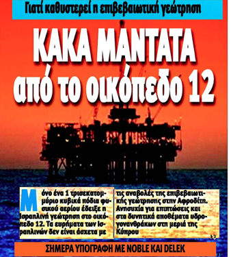 Η «Αλήθεια», στο κύριο της θέμα με τίτλο «Κακά μαντάτα από το οικόπεδο 12», γράφει ότι μόνο ένα τρισεκατομμύριο κυβικά πόδια φυσικού αερίου έδειξε η ισραηλινή γεώτρηση στο οικόπεδο 12 και προσθέτει ότι τα ευρήματα των Ισραηλινών δεν είναι άσχετα με τις αναβολές της επιβεβαιωτικής γεώτρησης στην Αφροδίτη, ενώ επικρατεί ανησυχία και για τις επιπτώσεις και τα δυνητικά αποθέματα υδρογονανθράκων στη μεριά της Κύπρου. Αλλού, γράφει για την κρίσιμη συνάντηση που πραγματοποιείται σήμερα με θέμα την απεργία στην οικοδομική βιομηχανία. Επίσης, αναφέρει ότι έντονες αντιδράσεις προκάλεσαν «οι αποκαλύψεις για τα χρήματα που εισέπραξε η οικογενειακή εταιρεία του υποψηφίου Προέδρου Γ. Λιλλήκα κατά την περίοδο που ήταν Υπουργός».