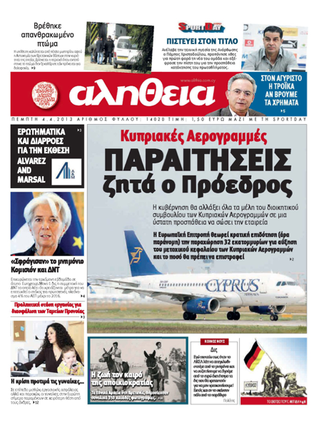 «Παραιτήσεις ζητά ο Πρόεδρος» είναι ο τίτλος του κυρίου θέματος της «Αλήθειας» που γράφει ότι η Κυβέρνηση θα αλλάξει όλα τα μέλη του ΔΣ των ΚΑ σε μια ύστατη προσπάθεια να σώσει την εταιρεία. Αλλού γράφει ότι εγείρονται ερωτήματα για την έκθεση των Alvarez&Marsal που διέρρευσε χθες και η οποία, σύμφωνα με την εφημερίδα, καίει επώνυμους. Επίσης η «Α» αναφέρει στο πρωτοσέλιδό της ότι το μνημόνιο επικυρώνεται την ερχόμενη εβδομάδα σε άτυπο Eurogroup και ότι η συνεισφορά του ΔΝΤ είναι μόλις 1 δις.