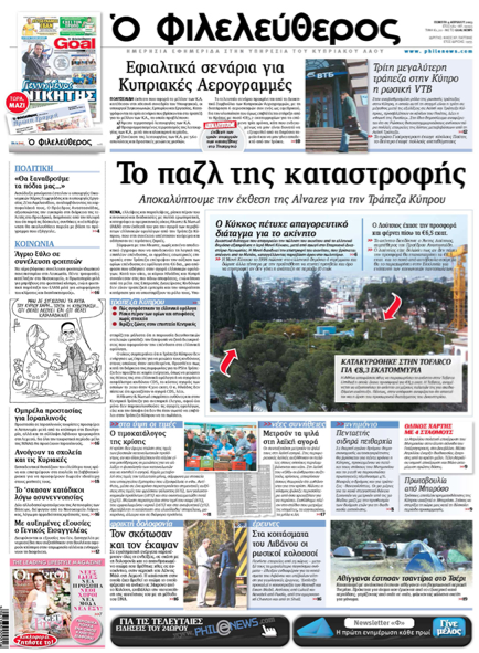 Ο «Φιλελεύθερος» τιτλοφορεί το κύριό του θέμα «Το παζλ της καταστροφής» και αναφέρεται στο πόρισμα των Alvarez&Marsal όπου καταγράφονται μεταξύ άλλων κενά, ελλείψεις και παραλείψεις, όπως αναφέρει, καθώς και ρίσκα που έπαιρναν κάποιοι εκτός του κανονικού. Αλλού η εφημερίδα αναφέρεται σε εφιαλτικά σενάρια για τις ΚΑ και ότι χθες στο Υπουργικό κατατέθηκε πολυσέλιδη έκθεση. Επίσης ο «Φ» γράφει ότι η Μονή Κύκκου πέτυχε απαγορευτικό διάταγμα για πώληση του ακινήτου απέναντι από το Μετόχι, από το ελληνικό δημόσιο.