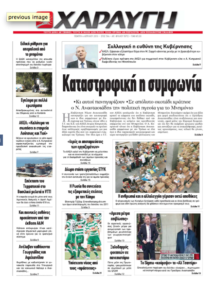 «Καταστροφική η συμφωνία» είναι ο κύριος τίτλος του πρωτοσέλιδου της «Χαραυγής» που αναφέρεται στις δηλώσεις χθες του Αντρου Κυπριανού για τη διαμόρφωση του μνημονίου με την Τρόικα και τις επικρίσεις ότι ο Πρόεδρος κράτησε τα κόμματα στο σκοτάδι. Αλλού αναφέρεται στον εντοπισμό του πτώματος στη Λεμεσό και γράφει για έγκλημα με πολλά ερωτήματα. Επίσης η «Χ» στην πρώτη της σελίδα γράφει ότι η VTTI μελετά επέκταση του τερματικού στο Βασιλικό.