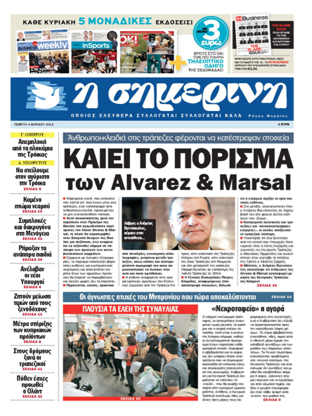 Η «Σημερινή» στεγάζει το κύριό της θέμα υπό τον τίτλο «Καίει το πόρισμα των Alvarez&Marsal» και αναφέρει ότι άνθρωποι-κλειδιά έχουν καταστρέψει μαρτυρικό υλικό που ενοχοποιεί κάποιους. Αλλού η «Σ» αναφέρεται στις δηλώσεις Γ. Ομήρου και Α. Νεοφύτου για το μνημόνιο όπου ο μεν πρώτος ζητά απεμπλοκή από τα πλοκάμια της Τρόικας και ο δεύτερος λέει να στείλουμε στον ‘αγύριστο’ την Τρόικα αν βρούμε από μόνοι μας τα χρήματα. Σε άλλο δημοσίευμα η εφημερίδα αναφέρει ότι η αγορά έχει παραλύσει εξαιτίας της κρίσης και ότι μικρή ανάσα έδωσε χθες η καταβολή μισθών και συντάξεων.