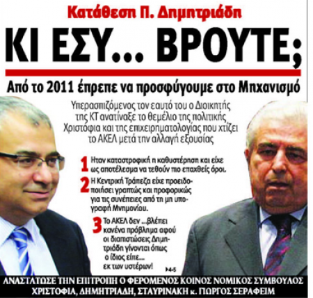 Η «Αλήθεια» κάτω από τον τίτλο «Κι εσύ…Βρούτε;» γράφει ότι υπερασπιζόμενος τον εαυτό του, ο Διοικητής της ΚΤ ανατίναξε το θεμέλιο της πολιτικής Χριστόφιας και της επιχειρηματολογίας που κτίζει το ΑΚΕΛ μετά την αλλαγή εξουσίας. Γράφει ότι αναστάτωσε την Επιτροπή ο φερόμενος κοινός νομικός σύμβουλος του Δημήτρη Χριστόφια, Πανίκου Δημητριάδη, Σπύρου Σταυρινάκη, Γιώργος Σεραφείμ γιατί δεν του άρεσαν οι ερωτήσεις που υποβλήθηκαν. Αναφέρει σε άλλο θέμα ότι η ΠΑΣΥΔΥ αντιδρά στα νέα ωράρια της δημόσιας υπηρεσίας από τις 8 το πρωί μέχρι τις 4.30 το απόγευμα που θα τεθούν σε εφαρμογή από την 1η Σεπτεμβρίου. Επίσης, γράφει για τη συμπλήρωση σήμερα οκτώ χρόνων από την τραγωδία της «Ηλιος».