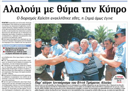 Η εφημερίδα «Ο Φιλελεύθερος» με κύριο τίτλο «Αλαλούμ με θύμα την Κύπρο» γράφει ότι ο διορισμός Καϊκίτη ανακλήθηκε χθες, η ζημιά όμως έγινε και αναφέρεται σε «διαχείριση μπανανίας», αλλά και σε «σκοπιμότητες και ασυνεννοησία Κυβέρνησης και Κεντρικής Τράπεζας». Αλλού γράφει ότι οι ψαράδες είναι εξαγριωμένοι για το γρι – γρι και παρ’ ολίγον να λιντσάρουν τον Διευθυντή του Τμήματος Αλιείας χθες στη Βουλή. Σε άλλο θέμα αναφέρει ότι αφαιρούν τα κλιματιστικά από τα σχολεία και διευκρινίζεται ότι λόγω κρίσης δόθηκαν οδηγίες να αποσυνδεθούν όσα θεωρούνται παράνομα.