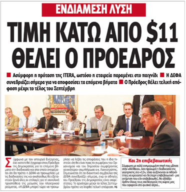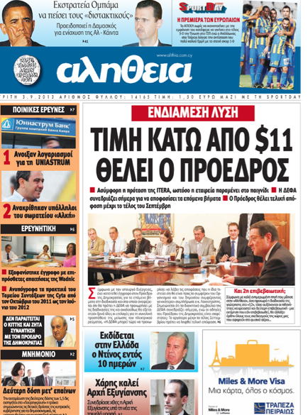 «Τιμή κάτω από $11 θέλει ο Πρόεδρος» είναι ο τίτλος στο κύριο θέμα της «Αλήθειας», η οποία γράφει για τη χθεσινή σύσκεψη στο Προεδρικό για την ενδιάμεση λύση, αναφέροντας ότι η πρόταση της ITERA είναι ασύμφορη, ότι η ΔΕΦΑ συνεδριάζει σήμερα και ότι ο Πρόεδρος θέλει τελική απόφαση μέχρι τέλος Σεπτεμβρίου. Αλλού γράφει ότι συνεχίζονται οι ποινικές έρευνες, αναφέροντας ότι άνοιξαν λογαριασμοί για τη UNIASTRUM και ότι ανακρίθηκαν υπάλληλοι του σωματείου «Αλκή». Σε άλλο θέμα γράφει για την κατάθεση του Πέτρου Χατζηαντωνίου στην Ερευνητική, ο οποίος παρέδωσε χθες εννιά κιβώτια με φακέλους εγγράφων, αλλά δεν εντόπισε επιστολή με τις απαιτήσεις Wadnic, η οποία οδήγησε στη σύναψη 2ης συμφωνίας για το έργο στη Δρομολαξιά.