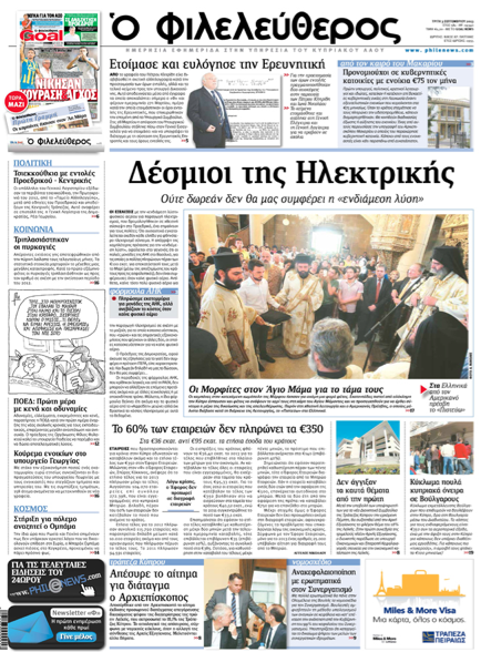 «Ο Φιλελεύθερος» στο κύριο θέμα του, με τίτλο «Δέσμιοι της Ηλεκτρικής» αναφέρεται στο θέμα της ενδιάμεσης λύσης, γράφοντας ότι εγκαταλείπεται σχεδόν κάθε ελπίδα για φθηνότερο ηλεκτρισμό σύντομα. Σύμφωνα με τον «Φ», η απόρριψη της χαμηλότερης πρότασης για την ενδιάμεση λύση οφείλεται ότι οι παλιές μονάδες της ΑΗΚ στο Βασιλικό δεν είναι συμφέρουσες όταν καίνε φυσικό αέριο. Σε άλλο της θέμα και κάτω από σχετική φωτογραφία η εφημερίδα γράφει για τη χθεσινή λειτουργία στον Άγιο Μάμα παρουσία του Αμερικανού Πρέσβη. Αλλού γράφει ότι εταιρείες που δραστηριοποιούνται για χρόνια στην Κύπρο αδυνατούν να καταβάλουν ακόμα και το ετήσιο τέλος των €350 στον Έφορο Εταιρειών, καθώς και ότι λόγω κρίσης ο Έφορος δεν προχωρεί σε διαγραφή εταιρειών.