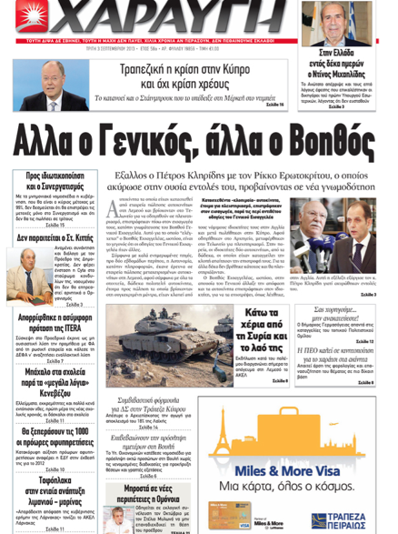 Η «Χαραυγή» γράφει στο κύριο θέμα της, με τίτλο «Άλλα ο Γενικός, άλλα ο Βοηθός» γράφει ότι έξαλλος είναι ο Πέτρος Κληρίδης με τον Ρίκκο Ερωτοκρίτου γιατί προέβηκε σε νέα γνωμοδότηση όσον αφορά κατασχεθέντα αυτοκίνητα που ήταν έτοιμα για πλειστηριασμό επιστρέφοντας τα πίσω στον εισαγωγέα τους. Αλλού η «Χ» γράφει ότι ο υποψήφιος των Σοσιαλδημοκρατών στη Γερμανία Πέερ Στάινμπρουκ υπέδειξε στη Μέρκελ κατά τη διάρκεια ντιμπέιτ ότι η κρίση στην Κύπρο είναι τραπεζική και όχι κρίση χρέους. Αλλού γράφει ότι με τα νομοσχέδια για το συνεργατισμό η Κυβέρνηση δεν δεσμεύεται ότι θα επιστρέψει τις μετοχές μόνο στο Συνεργατισμό και ότι δεν θα τις πωλήσει σε τρίτους.