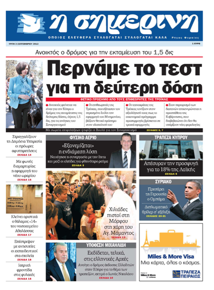 «Η Σημερινή» τιτλοφορεί το κύριο της θέμα «Περνάμε το τεστ για τη δεύτερη δόση» και γράφει ότι ανοικτός φαίνεται να είναι για την Κύπρο ο δρόμος της εκταμίευσης της δεύτερης δόσης, ύψους 1,5 δισ. για τις ανάγκες του Συνεργατισμού, καθώς και ότι η Κυβέρνηση επικεντρώνεται στον περιορισμό δαπανών και διαβεβαιώνει ότι δεν θα υπάρξουν νέες φορολογίες. Αλλού γράφει ότι εξανεμίζεται η ενδιάμεση λύση και ότι ναυάγησε η συνεργασία με την Itera και μαζί οι ελπίδες για φθηνότερο ρεύμα. Σε άλλο της θέμα αναφέρει ότι αποσύρθηκε η προσφυγή για το 18% της Λαϊκής.