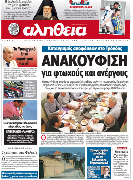 Η «Αλήθεια» υπό τον τίτλο «Ανακούφιση για φτωχούς και ανέργους» γράφει ότι με απόφαση του Υπουργικού Συμβουλίου κατά την χθεσινή του συνεδρία στην προεδρική εξοχική κατοικία στο Τρόοδος καταργήθηκε ο φόρος για χαμηλής αξίας ακίνητη περιουσία. Για ακίνητη περιουσία μέχρι 5.000 (αξία του 1980) καταργείται οποιαδήποτε φορολογία, όπως και το ελάχιστο ποσό των 75 ευρώ για περιουσία μέχρι 40.000 ευρώ. Σε άλλο θέμα γράφει ότι δημόσια η Κυβέρνηση καλεί το ΔΣ της Cyta και τον Πρόεδρο του Στάθη Κιττή να παραιτηθούν. Αλλού γράφει ότι με βάση τους ρύπους και όχι την ιπποδύναμη θα είναι η φορολογία των οχημάτων.
