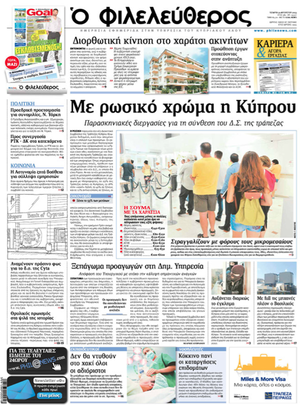 «Ο Φιλελεύθερος» υπό τον τίτλο «Με ρωσικό χρώμα η Κύπρου» γράφει ότι η ρωσική παρουσία στο νέο Διοικητικό Συμβούλιο της Τράπεζας Κύπρου θεωρείται δεδομένη, αυτό που απομένει είναι η επιλογή των προσώπων. Σημειώνεται ότι το 53% των μετόχων είναι ξένοι. Σε άλλο θέμα γράφει ότι το Κτηματολόγιο απέστειλε χθες στο Τμήμα Εσωτερικών Προσόδων το αρχείο με όλες τις πληροφορίες για τα ακίνητα των φορολογουμένων. Αλλού γράφει ότι ξεπάγωμα των προαγωγών για συγκεκριμένες υπηρεσίες του Δημοσίου, η λειτουργία των οποίων επηρεάζεται άμεσα από την απόφαση της Βουλής των Αντιπροσώπων για πάγωμα όλων των προσλήψεων και προαγωγών στην Δημόσια Υπηρεσία, αποφασίστηκε στη χθεσινή συνεδρία του Υπουργικού Συμβουλίου.