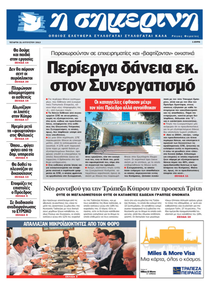 «Η Σημερινή» υπό τον τίτλο «Περίεργα δάνεια εκ. στον Συνεργατισμό» γράφει ότι δάνεια δόθηκαν από συγκεκριμένη ΣΠΕ σε επιχειρήσεις, χωρίς να εξυπηρετούνται, και όλα αυτά, καθώς και προειδοποιήσεις, αναφέρονται στις εκθέσεις της Ελεγκτικής Υπηρεσίας του Συνεργατισμού, οι οποίες, όμως, δεν λήφθηκαν υπόψη από τους υπευθύνους. Σε άλλο θέμα γράφει ότι «νέο ραντεβού για την Τράπεζα Κύπρου την προσεχή Τρίτη» και πως ούτε οι μεγαλομέτοχοι ούτε οι καταθέτες έδωσαν γραπτώς ονόματα για τα άτομα τα οποία επιθυμούν να τους εκπροσωπούν στο νέο συμβούλιο της Τράπεζας Κύπρου. Αλλού γράφει ότι «απάλλαξαν μικροϊδιοκτήτες από τον φόρο» ύστερα από την χθεσινή απόφαση του Υπουργικού για τροποποίηση της νομοθεσίας για τα ακίνητα.