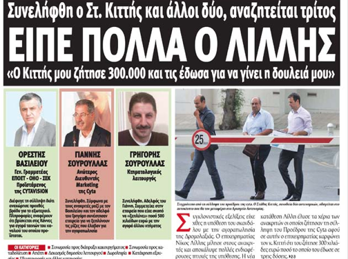 Η αγγλόγλωση “The Cyprus Daily” στο κύριο θέμα της με τίτλο «Υπό κράτηση ο Κιττής» γράφει ότι συνελήφθηκε χθες ο Πρόεδρος του ΔΣ της CyTA Στάθης Κιττής σε σχέση με το σκάνδαλο για την αγοραπωλησία τ/κ γης στη Δρομολαξιά ενώ συνελήφθηκαν επίσης ο Γιάννης Σουρουλάς, Ανώτερος Διευθυντής Marketing της Cyta και ο αδελφός του, Γρηγόρης Σουρουλλάς, Κτηματολογικός λειτουργός. Εκκρεμεί ένταλμα σύλληψης εναντίον του Ορέστη Βασιλείου, Γενικού Γραμματέα της ΕΠΟΕΤ-ΟΗΕ-ΣΕΚ, προϊστάμενου της Cytavision. Αναφέρει επίσης ότι οι αρχές θα διερευνήσουν καταγγελίες του ΑΚΕΛ περί μετατροπής κατασκηνώσεων σε «πεδία στρατιωτικών ασκήσεων». Γράφει αλλού ότι την πρώτη εβδομάδα του Οκτώβρη αναμένεται να ανακοινωθούν τα επίσημα προκαταρκτικά αποτελέσματα της επιβεβαιωτικής γεώτρησης.