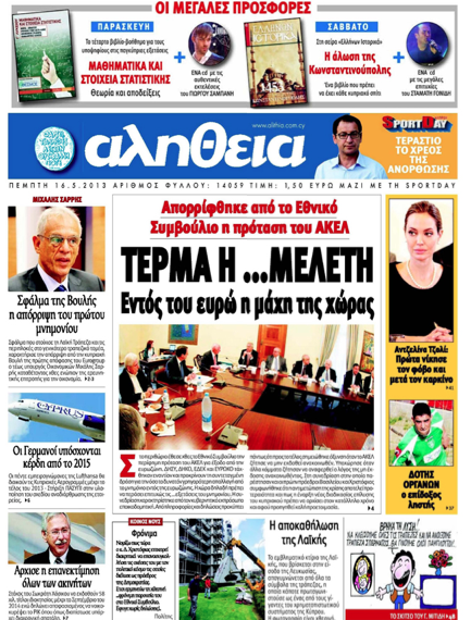 «Η Αλήθεια», με πρωτοσέλιδο τίτλο «Τέρμα η … μελέτη», γράφει ότι στο περιθώριο έθεσε χθες το Εθνικό Συμβούλιο την περίφημη πρόταση του ΑΚΕΛ για έξοδο από την ευρωζώνη. Αλλού, γράφει ότι το εμβληματικό κτίριο της Λαϊκής Τράπεζας που βρίσκεται στην είσοδο της Λευκωσίας απογυμνώνεται από όλα τα σύμβολα της τράπεζας η οποία κάποτε πρωταγωνιστούσε ως ένας από τους γίγαντες του χρηματοπιστωτικού συστήματος της Κύπρου. Επίσης, η ‘Α’ γράφει ότι άρχισε η επανεκτίμηση όλων των ακινήτων και ότι στόχος του ΥΠΕΣ είναι να εκδοθούν 58,000 τίτλοι μέχρι τον Σεπτέμβριο του 2014.